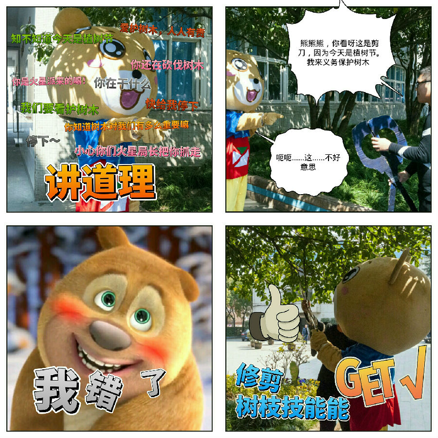 熊熊熊冲出吃瓜群众堆,老师附身~上去就是对园艺工一顿教育,可事实……“你看看好,这是剪刀,今天是植树节,我来义务保护树木”