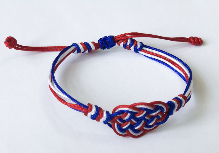 这条“祥云在手旁”的手链运用了发髻结,金刚结以及双向平结编成。