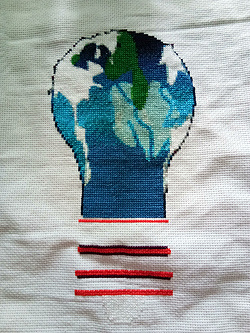 正好前段时间在绣十字绣,既然原创就想到自己设计绣出来,专门去网上定制的,一开始想设计环保海报来绣出来的,但是海报中的地球实在有点难画,就想到画灯泡,地球在里面照明,正是因为人类的智慧才使得地球这样好看,有亮光,下面的三根红线表面是链接灯泡的,其实表示我对于人类不环保的三条禁止红线,不大量乱使用灯泡,后面白色部分就是已用的资源。地球资源有限,我们要节能环保。