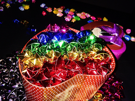 不同的颜色的纸张,折叠成五角星的样子。再制作一个心型盒子,将五角星放入其中。主要作为家中摆饰装饰使用。