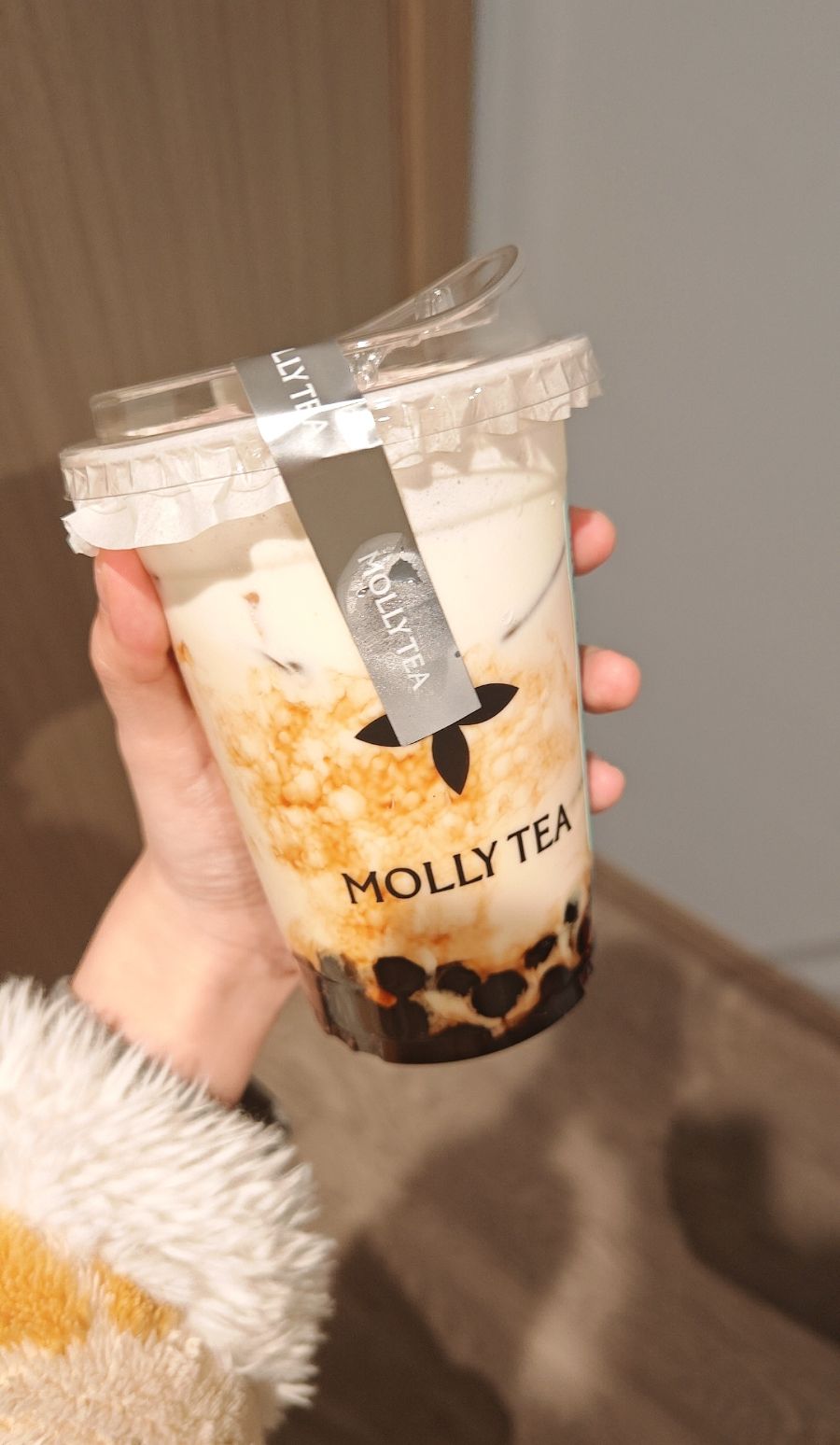 这是一张手持奶茶的生活随拍,画面主体是一杯MOLLY TEA(茉莉奶白)的饮品。透明杯身清晰呈现分层结构:杯底是饱满Q弹的黑糖珍珠,中间是绵密的奶白茶汤,顶部是细腻的奶盖,黑糖挂壁形成自然的琥珀色纹路,颜值拉满。杯身印有黑色品牌名“MOLLY TEA”和三瓣叶品牌logo,杯盖用透明防漏盖密封,缠绕着银灰色品牌腰封。拍摄者的手轻握杯身,袖口是软糯的毛绒材质,暖调光线衬出奶茶的治愈感,整体画面充满生活气息,是典型的奶茶打卡照,传递出惬意的休闲氛围。