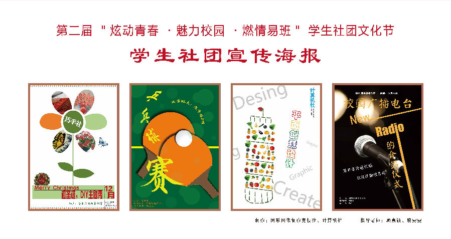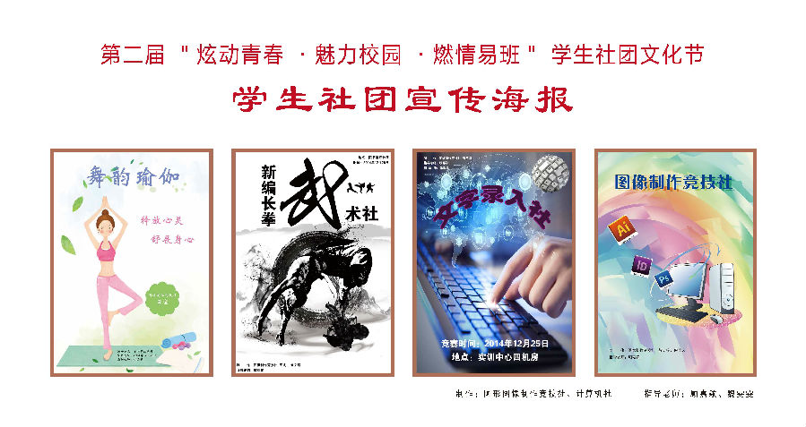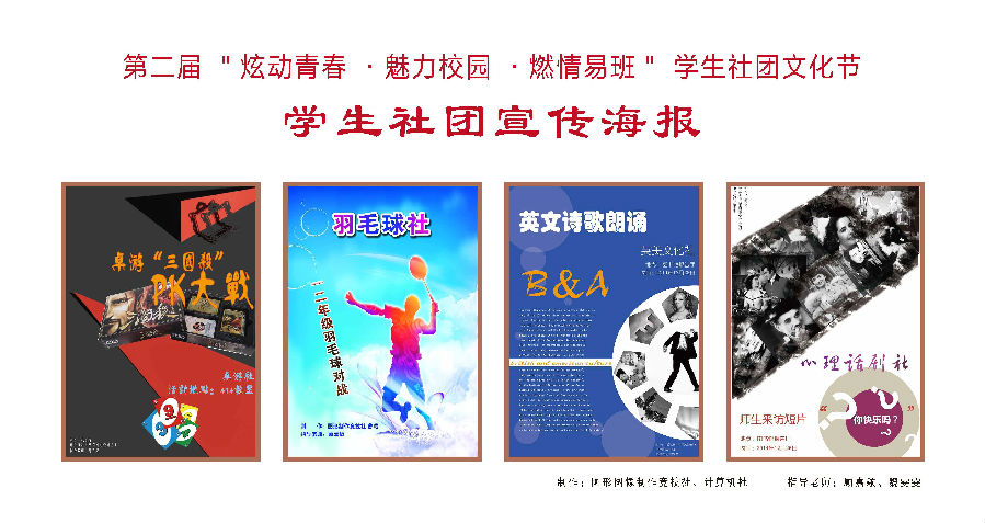 第二届“炫动青春 魅力校园 燃情易班”学生社团文化节正式拉开帷幕了~~。此次社团文化节,各社团老师和同学们都踊跃参加,图形图象竞技制作社和计算机社强强联手,为此次文化节每个社团都设计制作了漂亮的宣传海报,接下来请大家一起欣赏他们设计的海报~~我们将在文化节后开设投票活动,到时请为你喜爱的海报投上一票噢~~